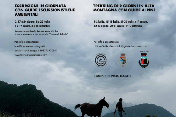 il percorso inizia lungo una sterrata per inoltrarsi poi su bella mulattiera nel bellissimo vallone di Frudière, attraversando boschi di conifere, rododendri, mirtilli e sfiorando alpeggi e vecchi ruderi. Il lago di Frudière o Lago di Grana si trova in una conca “magica” dai colori brillanti, grazie ai tanti ruscelli, alla vegetazione fitta, agli ultimi pascoli ed al riverbero del lago. Segue una pausa pranzo al lago. Si rientra passando dagli alpeggi del Lago, da Chastellet e quindi dal ponticello del bivio, lungo lo stesso percorso dell’andata, che si può alternare a pezzi di vecchia mulattiera.Il percorso include un pranzo al sacco, preparato da ‘Il Pranzo di Babette”, altra location che appare nel film e trasportato dal mulo durante l’escursione.